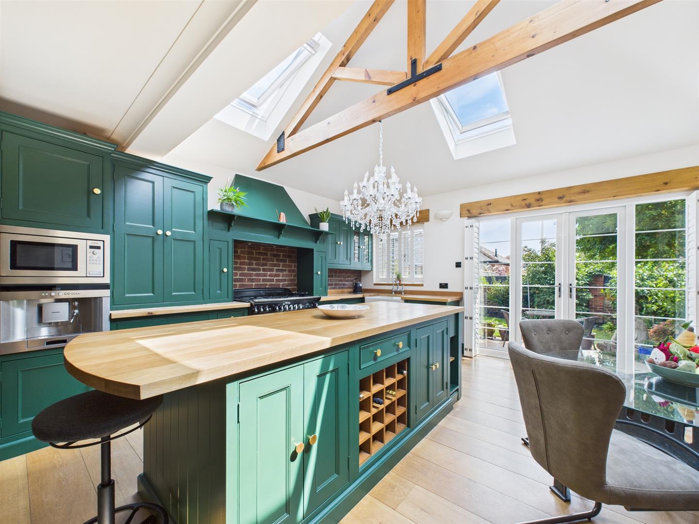 Briefly comprising: Entrance vestibule to a spacious hallway giving access to all rooms. To the front is an attractive living room featuring a bay window with fitted shutters, cast iron radiator and fireplace housing a log stove effect gas fire. Overlooking the rear garden is a fantastic extended kitchen/diner/family room boasting a partially vaulted ceiling with exposed beams, Velux windows and double doors opening out to the rear garden. This impressive room provides a generous amount of space ideal for entertaining friends and family. The well equipped kitchen has a good range of fitted wall and base units as well as a large island providing additional storage and seating. Integrated appliances include a Range style oven, extractor fan, dishwasher, coffee machine and microwave. The seating area offers a comfortable space for seating with an attractive fireplace housing a gas fire. A handy utility room provides additional storage and plumbing for a washing machine.
