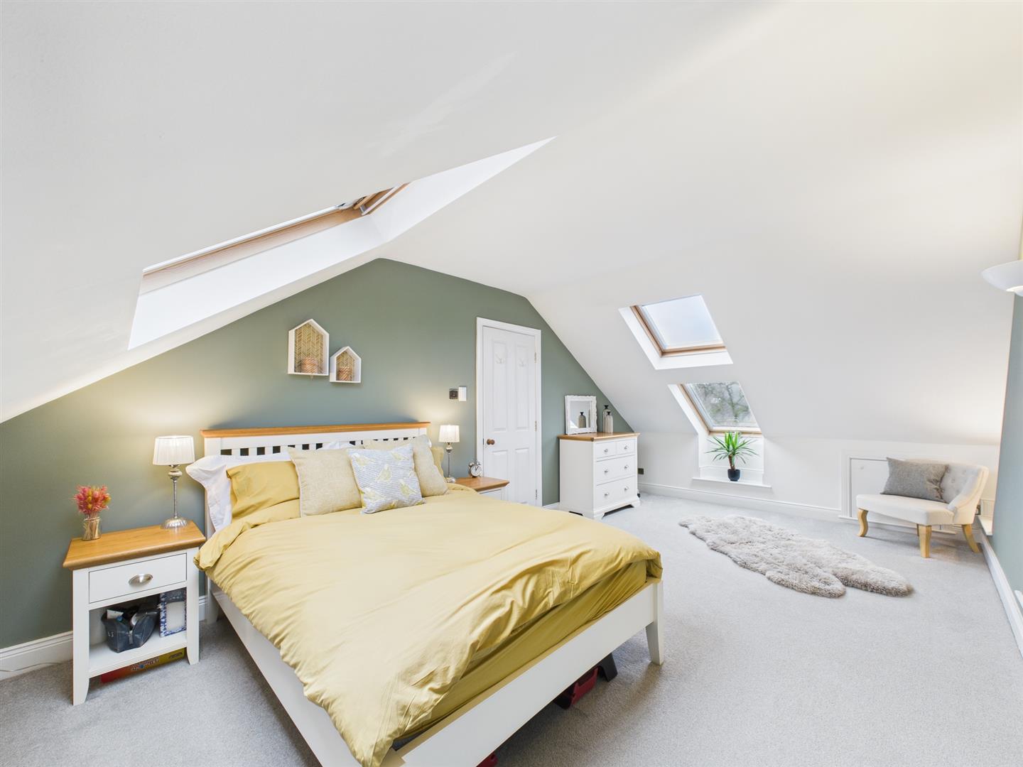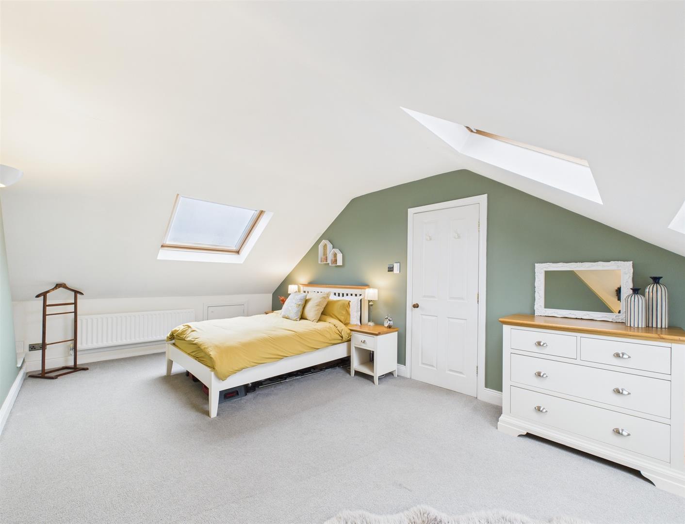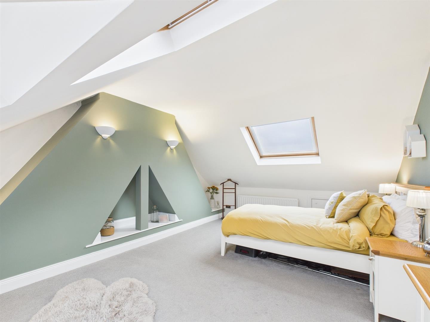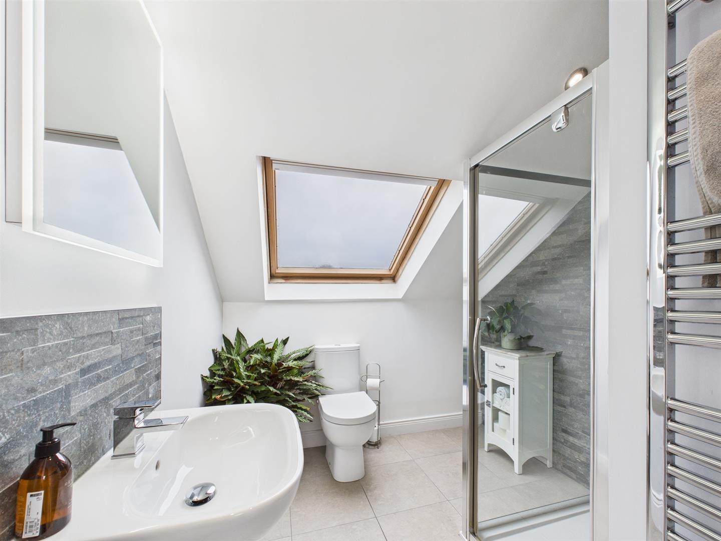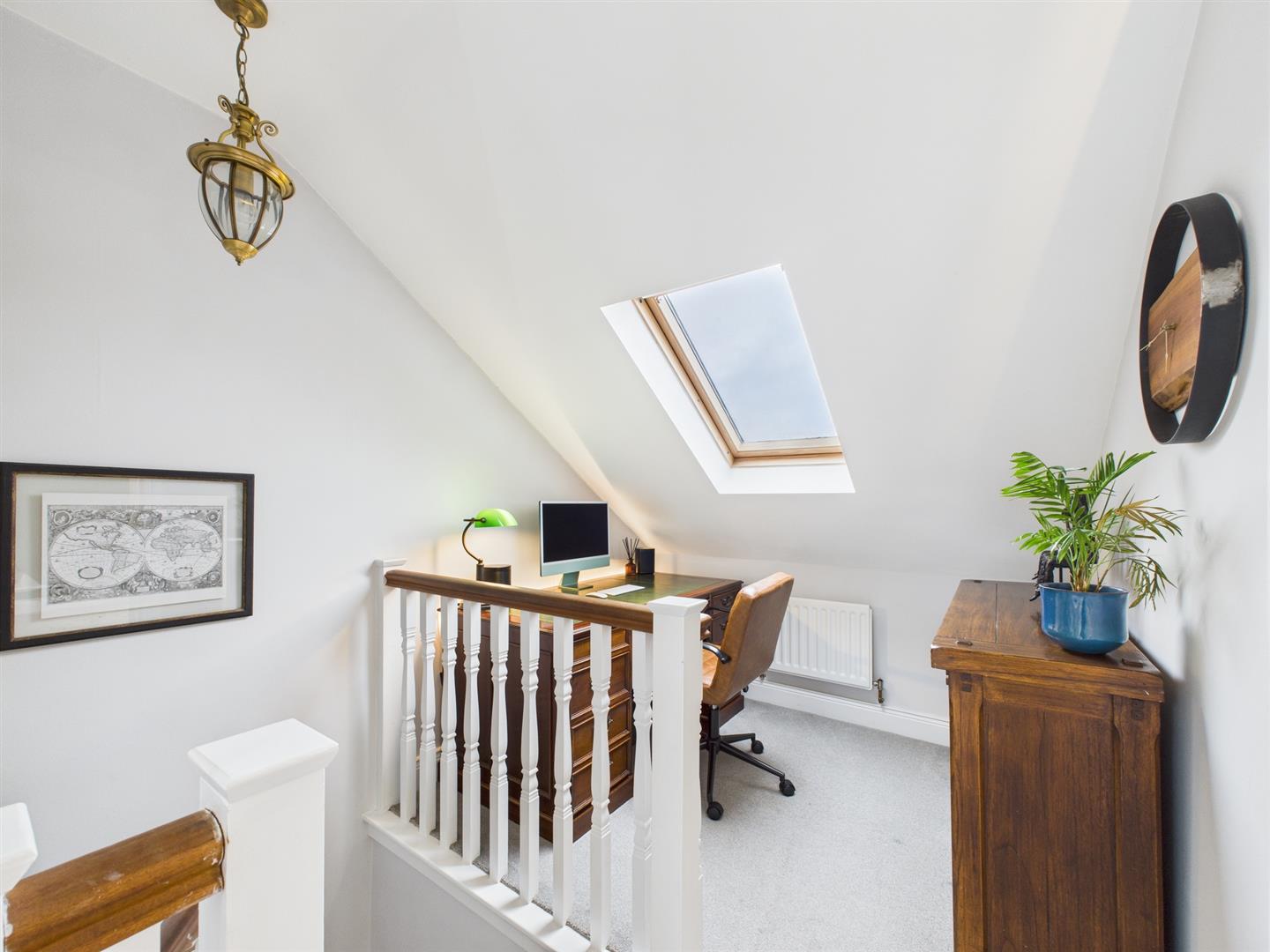 The top floor landing offers a useful space which is currently being utilised as a work area. The large double bedroom is bright and airy with Velux windows and built in eaves storage. A separate modern shower room comprises a step in shower, hand basin, W.C. and heated towel rail.