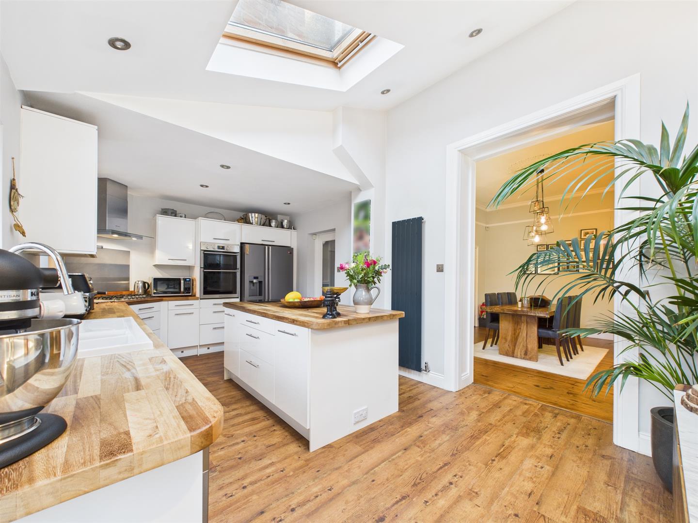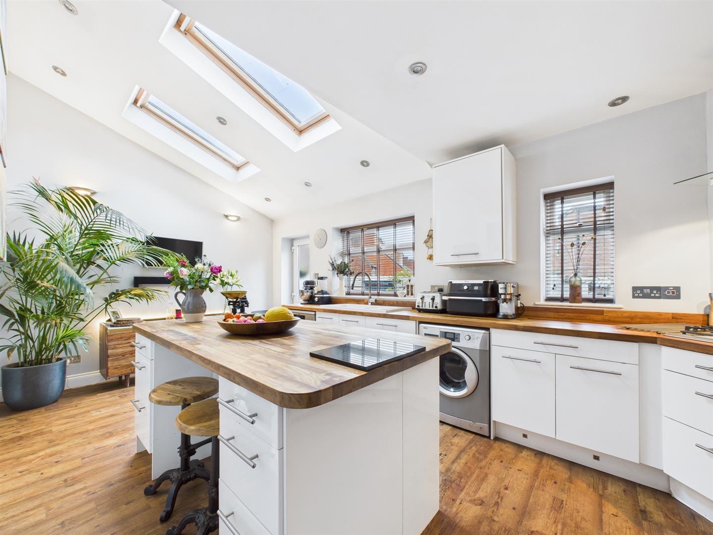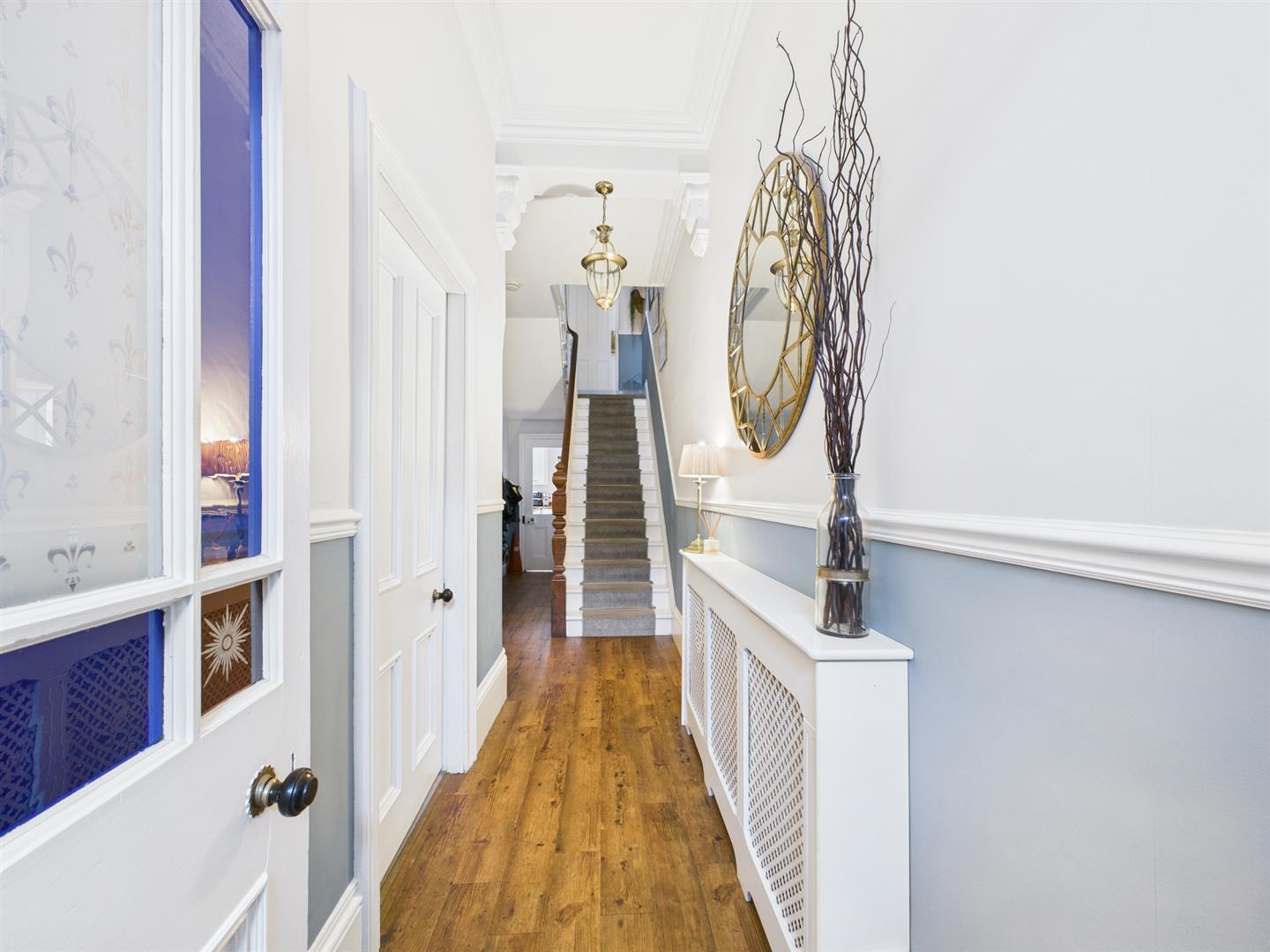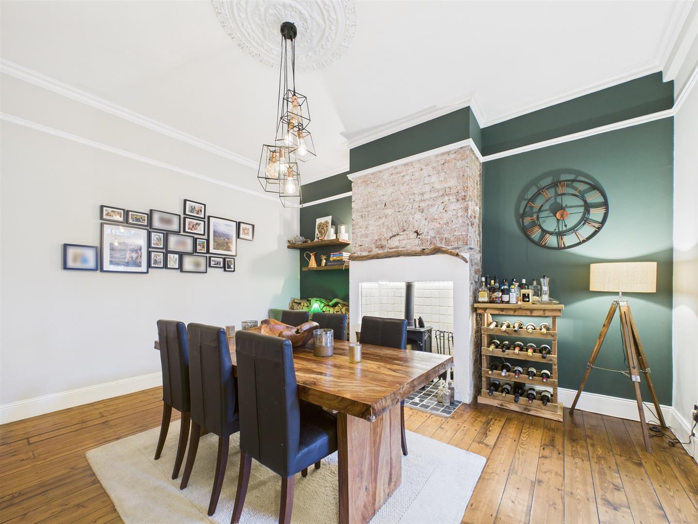 Briefly comprising: Entrance vestibule leading to a welcoming hallway leading to all ground floor rooms and stairs to the first floor. Overlooking the front of the property is an impressive living room offering a generous amount of space, featuring high ceilings, decorative coving, ceiling rose, picture rail, large bay window and fireplace housing a gas fire. A further reception room to the rear is another attractive space which is being used as a dining room, there is an open fireplace housing a log burning stove and an opening to the kitchen/breakfast room. The well equipped kitchen features a vaulted ceiling with Velux windows allowing plenty of light to fill the room. There are a good range of wall and base units with wooden worktops, a central island provides storage as well as seating. Integrated appliances include a five ring gas hob, electric double oven, extractor hood, space for a fridge/freezer, plumbing for a washing machine and dishwasher.