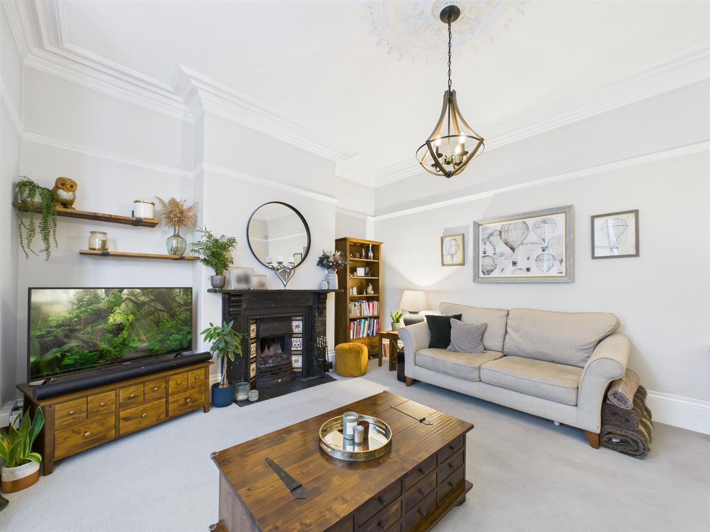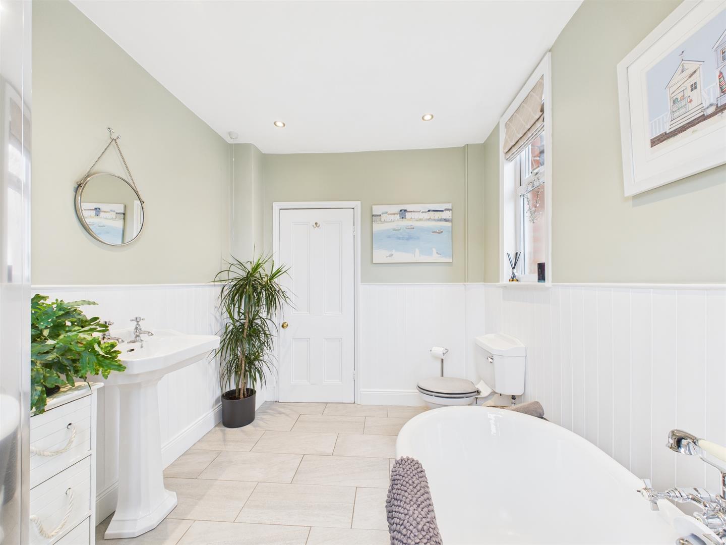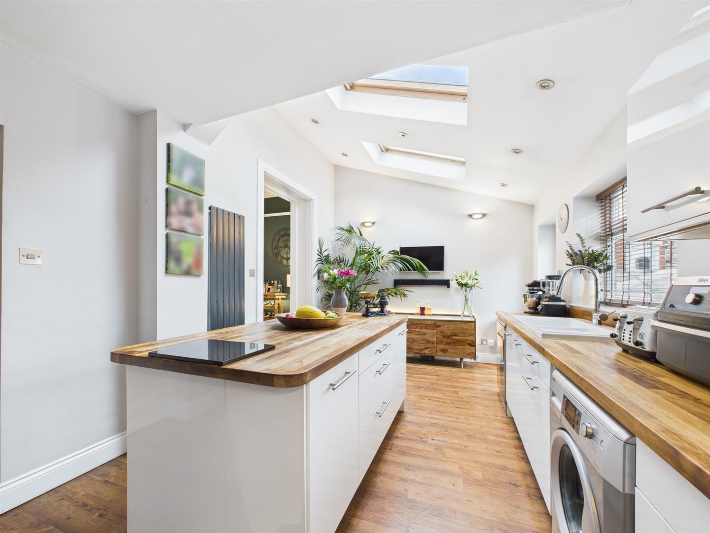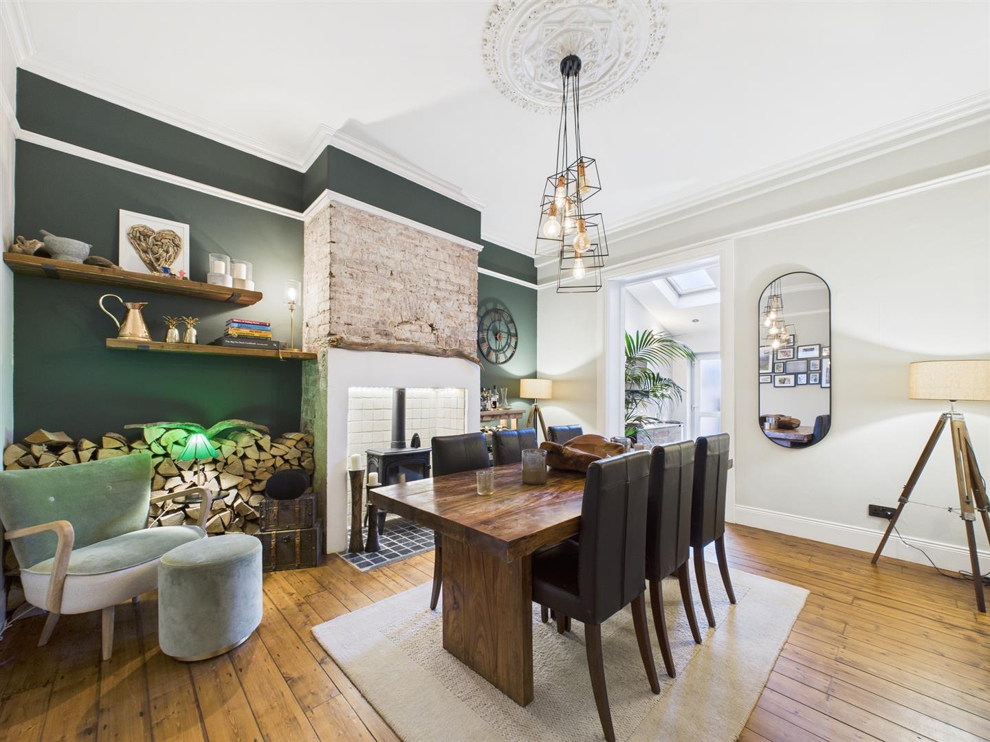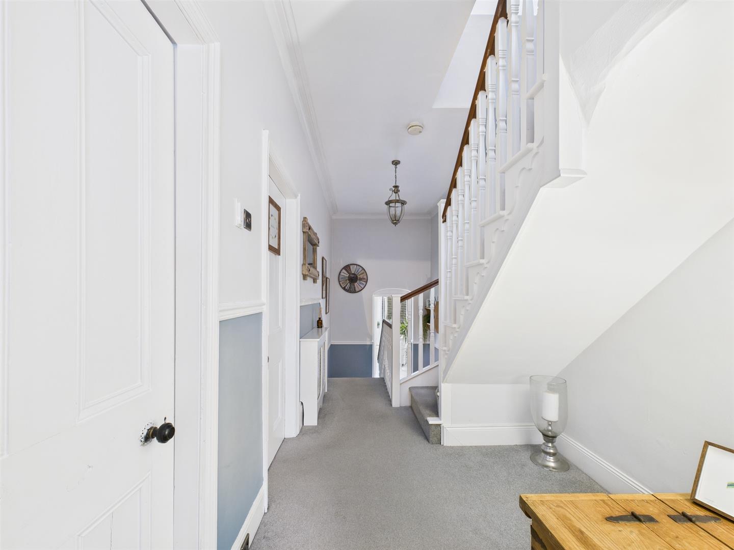 Briefly comprising: Entrance vestibule leading to a welcoming hallway leading to all ground floor rooms and stairs to the first floor. Overlooking the front of the property is an impressive living room offering a generous amount of space, featuring high ceilings, decorative coving, ceiling rose, picture rail, large bay window and fireplace housing a gas fire. A further reception room to the rear is another attractive space which is being used as a dining room, there is an open fireplace housing a log burning stove and an opening to the kitchen/breakfast room. The well equipped kitchen features a vaulted ceiling with Velux windows allowing plenty of light to fill the room. There are a good range of wall and base units with wooden worktops, a central island provides storage as well as seating. Integrated appliances include a five ring gas hob, electric double oven, extractor hood, space for a fridge/freezer, plumbing for a washing machine and dishwasher.