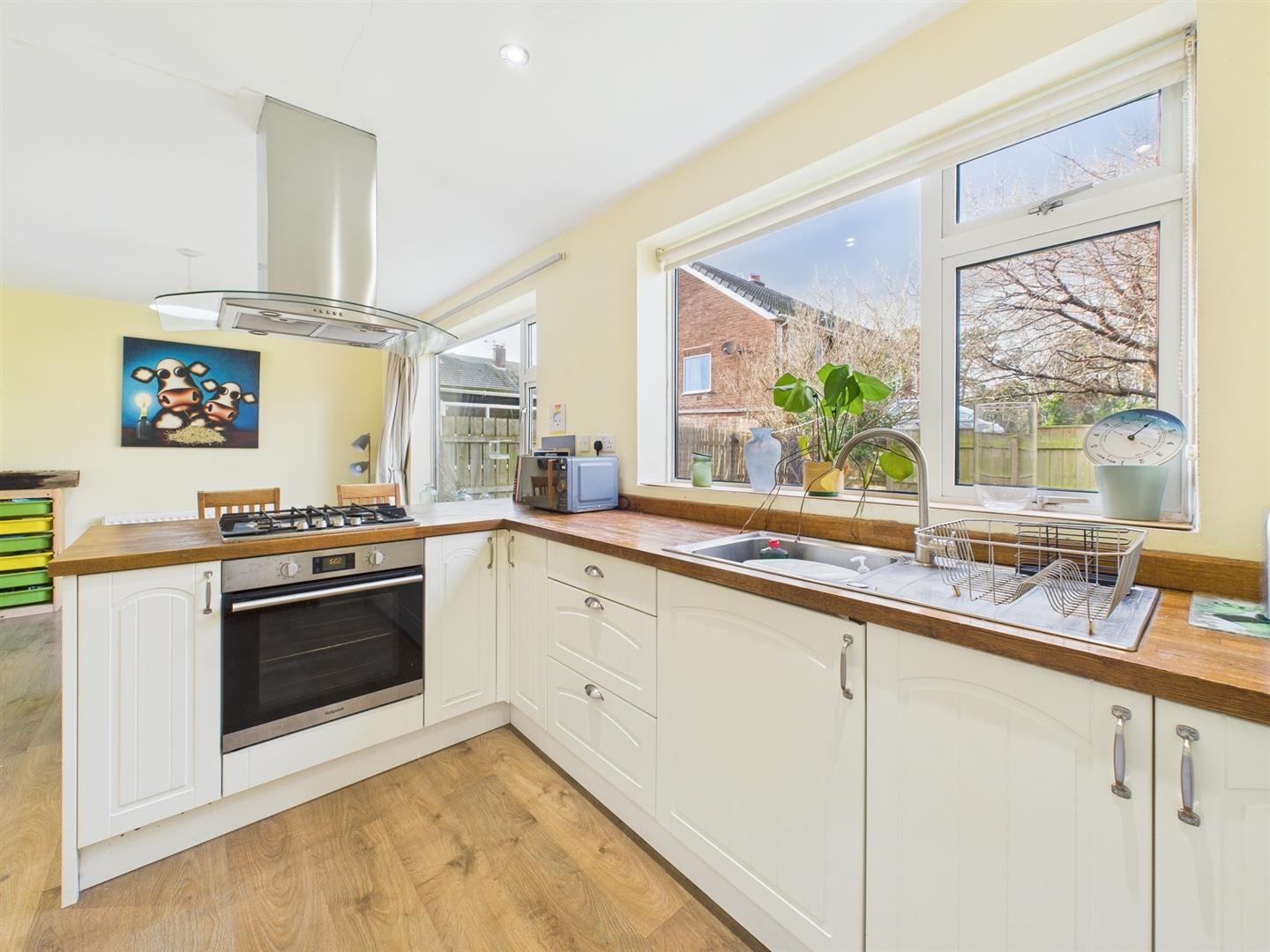 To the rear is a spacious kitchen/diner spanning the width of the home and housing access to the garage and hallway. Benefitting from a good range of base and drawer units framed with solid wood worktops, the kitchen also provides integral appliances of a floating extractor hood, oven, hob and sink. Configured to house a six seater dining table, the open plan design creates a social family space, complete with an integral pantry cupboard.